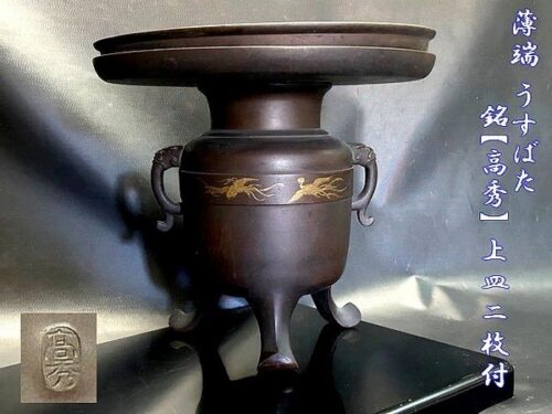 金属工芸品 茶道具 仏具【薄端/うすばた 銘【高秀】鳳凰文 上皿二枚付 水盤 猫足 三足